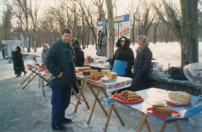 8. Стихийный рынок кондитерских изделий, на заднем плане афиша группы «Мумий Тролль». Донецк, 1990-е годы.