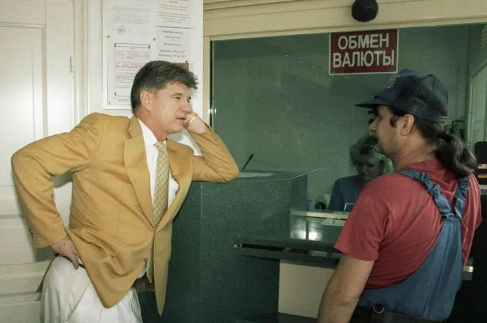12. Депутат Госдумы, бизнесмен Владимир Брынцалов в пункте обмена валюты в банке, 1990-е годы.