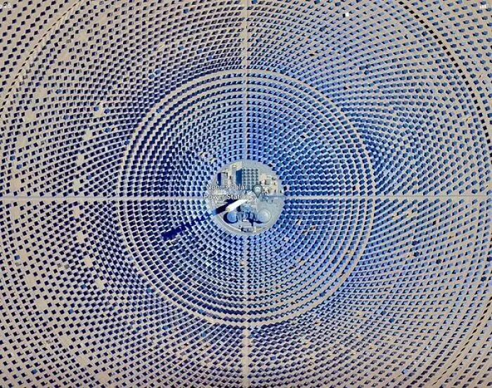 Зеркала направляют свет на башню, где свет нагревает расплавленную соль. Расплавленная соль создает пар, который вращает турбины и запускает генераторы.