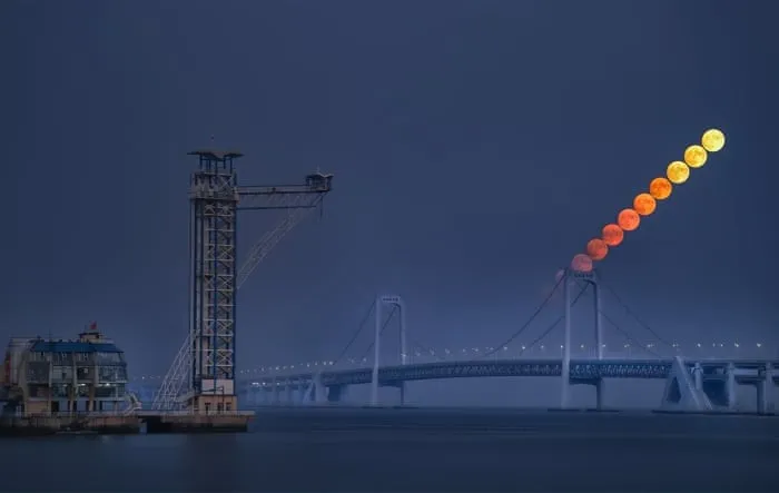 7. Восход луны над мостом через залив Синхай в Даляне, Китай. Фотограф - Haohan Sun