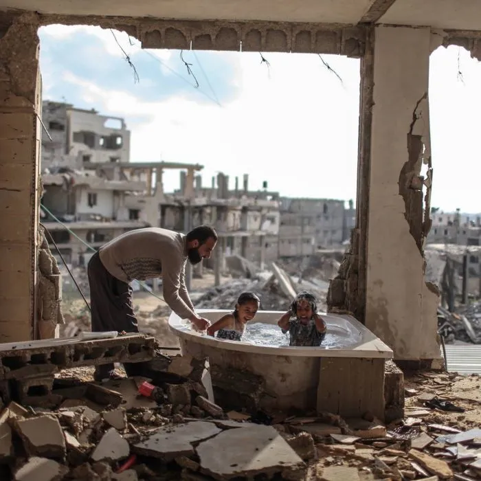 Отец купает свою дочь и племянницу в разрушенном доме в Газе. 2015
