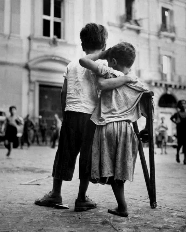 20. Мальчик помогает своему младшему брату, потерявшему ногу во время бомбардировки Неаполя. Италия, 1944