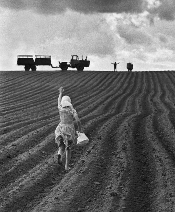 10. Девочка несет перекус своему отцу, который усердно работает на поле, 1975 год