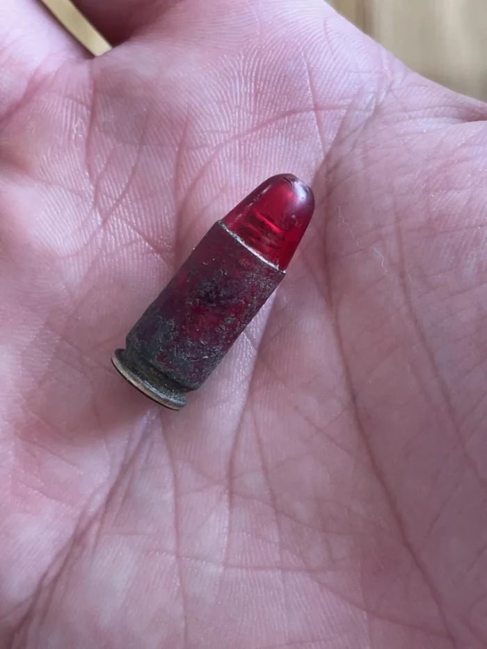 5. Я нашел это в своей машине после покупки, похоже на патрон, но с красным прозрачным снарядом.