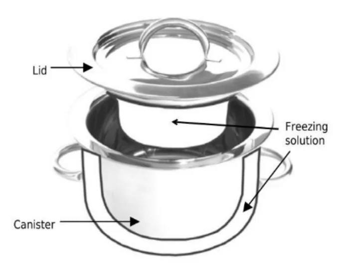 Это кастрюля для изготовления мороженого. Она ставится в морозилку, после чего надо ее достать, положить туда ингредиенты для мороженого, подождать минут 20, перемешать и так далее до заморозки смеси.