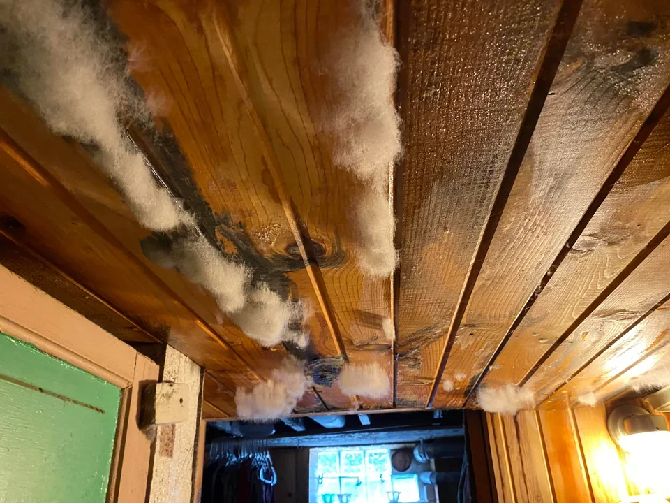 Наверное, владельцу подвала было неприятно увидеть это на своём потолке, но выглядит забавно: будто кто-то вычесал кота и приклеил туда его шерсть, куда не следует.