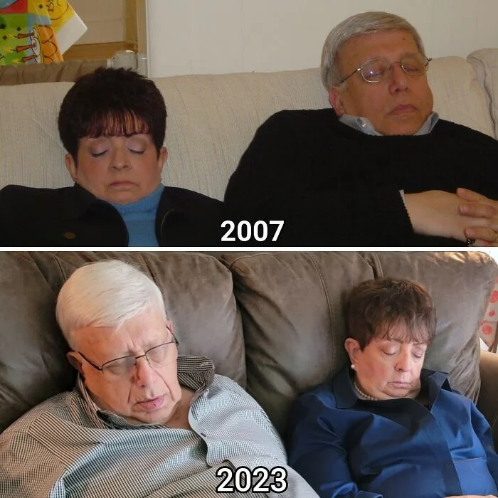 2. "Мы с женой в 1973 году и в 2019. На первой фотографии мне только исполнилось 16 лет. Это был наш первый совместный снимок, сделанный в фотобудке в торговом центре"