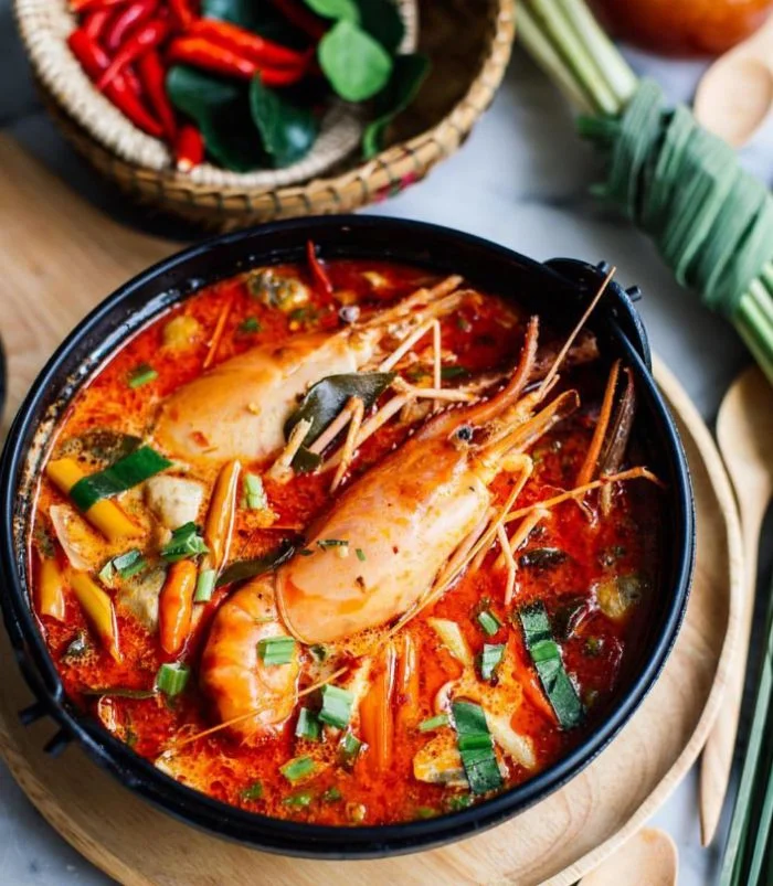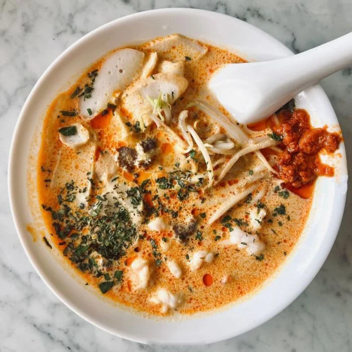 Асам-лакса готовится на основе рыбного бульона из сушёных анчоусов. В него обязательно идут рыба, креветки и различные морепродукты.