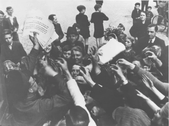 Раздача текста капитуляции немецкому населению. 8 мая 1945 г.