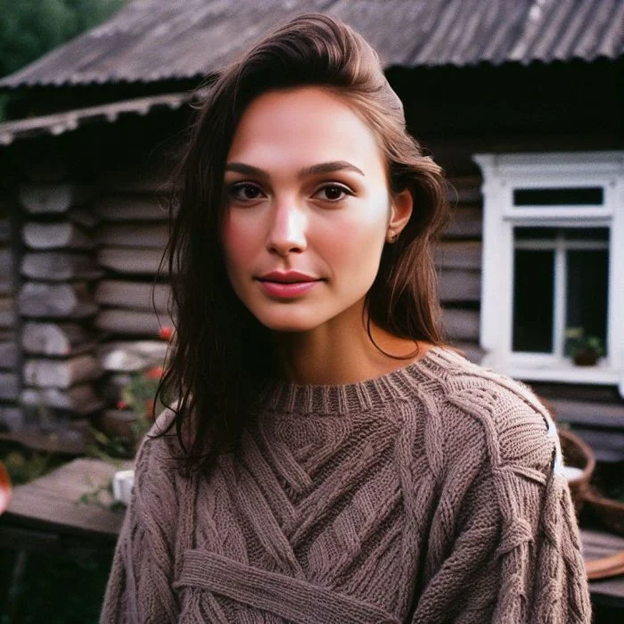 Галь Гадот (Чудо-женщина) сидит в свитере крупной вязки на фоне деревянного домика.
