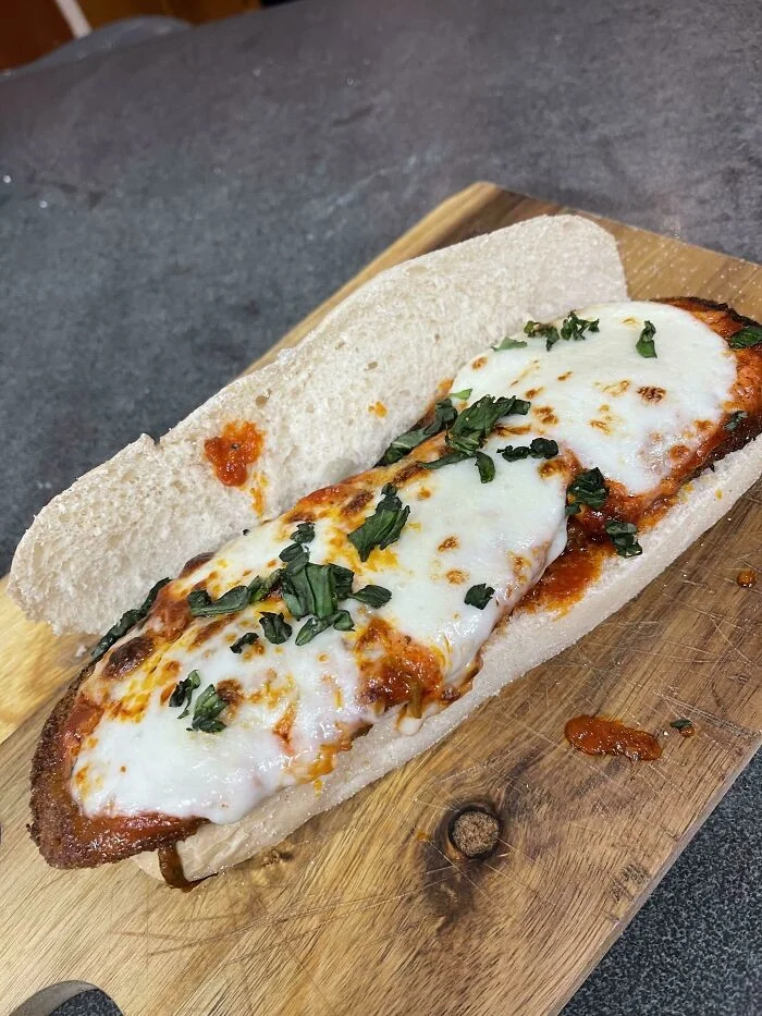 16. Огромный бутерброд с курицей пармиджана (панированная куриная грудка, покрытая томатным соусом и сыром моцарелла и приготовленная на сковороде)