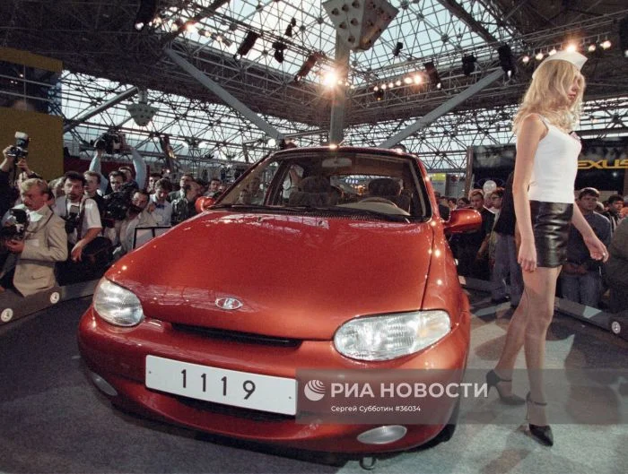 6. Автомобиль "Лада 1119" "Калина", производства завода АвтоВаз, на выставке IV Международного автосалона. Москва, 1999 год.