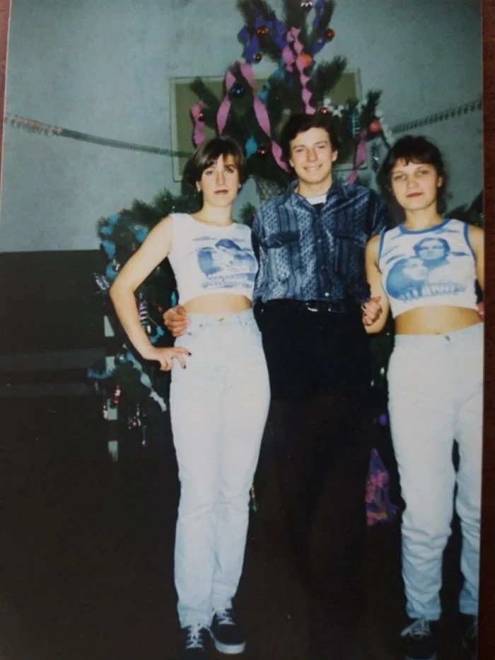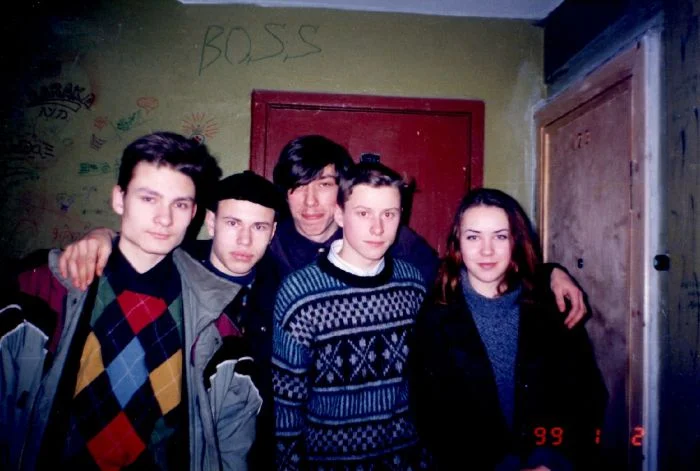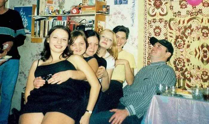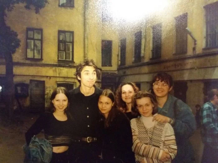 16. Михаил Горшенёв с поклонницами возле Ленинградского рок-клуба, 1997 год.