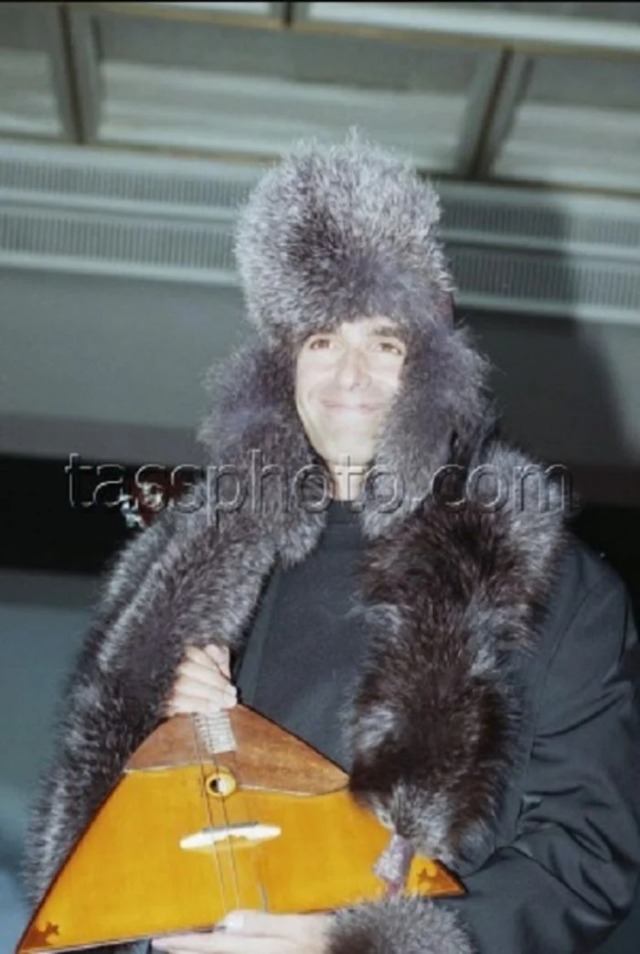 Фото сделано во время принятия подарков от российских фанатов на вечеринке, устроенной в его честь в рамках гастролей, в Государственном Кремлевском дворце. Москва, 9сентября 1997 года.