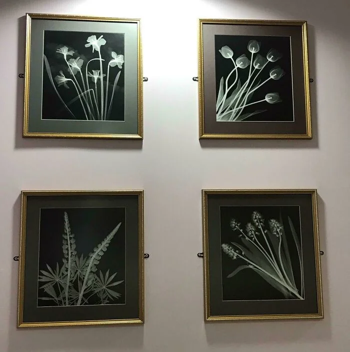 2. Комната ожидания рядом с рентгеновским кабинетом в больнице украшена картинами. Это цветы — рентгеновские снимки