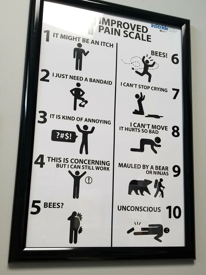 Ну так, небольшой зуд Просто нужен пластырь Боль немного раздражает Боль доставляет неудобство, но я все еще трудоспособен Пчелы, что ли? А-а-а! Пчелы! Плачу от боли Так болит, что не могу пошевелиться На меня напал медведь или ниндзя Лежу без сознания