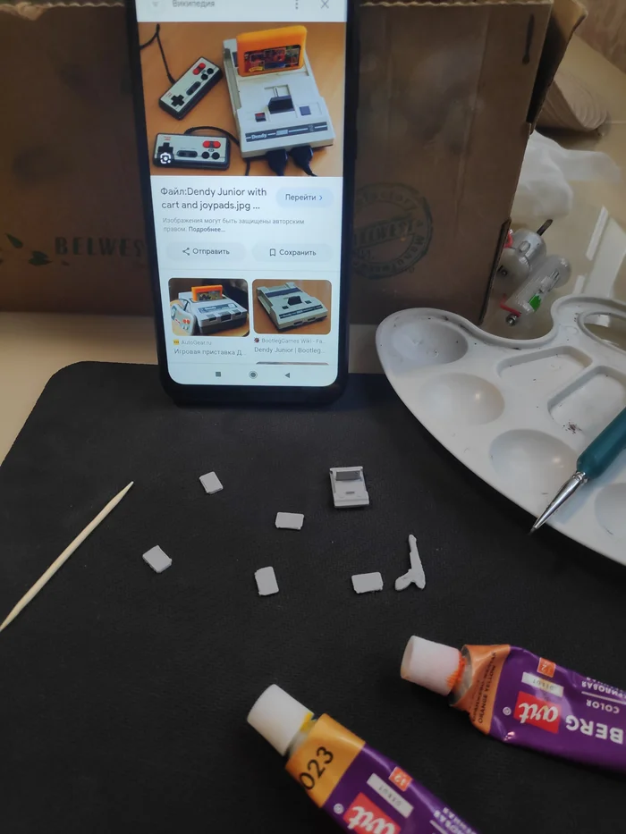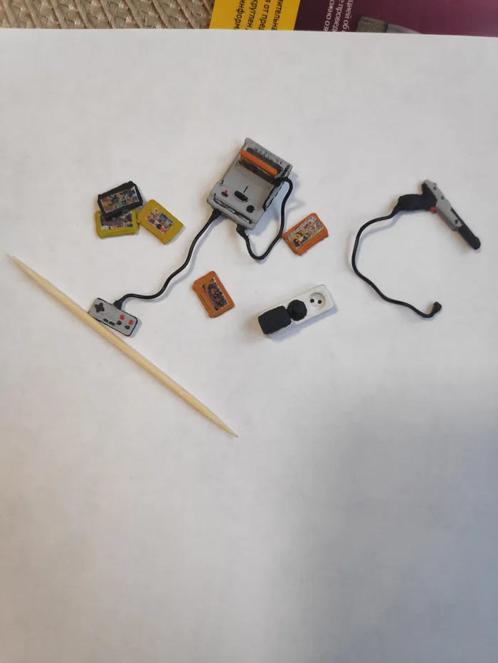 Денди после финальной покраски. Зубочистка -для сравнения масштаба. Провода настоящие, взял от старой разломанной игрушки сына.