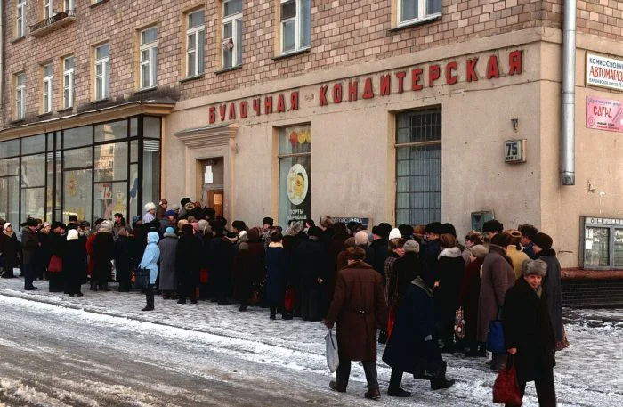 10. Огромная очередь в булочную на Варшавском шоссе.