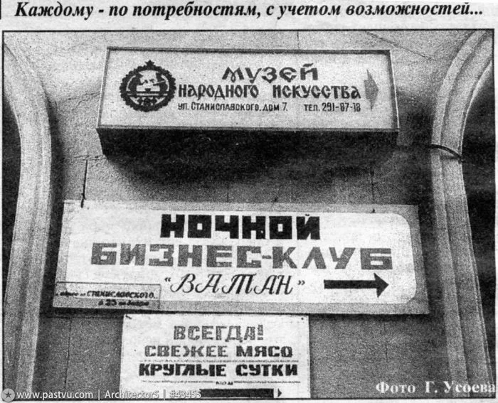На фото — вывески в Леонтьевском переулке. Солидным господам — ночной бизнес-клуб "Ватан", культурным барышням — музей, хозяйственным матерям семейств — мясо. Главное — не перепутать.