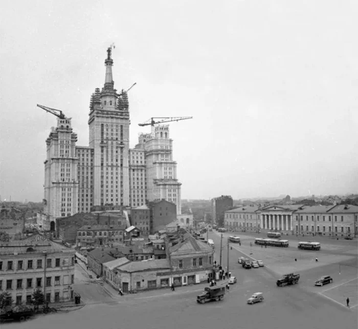 Согласно проекту, центральная часть здания венчалась прямоугольной башней. В 1951 году здание было практически завершено. Шпиль был достроен по личному указанию И. Сталина. Его выполнили из металла, а не из камня, чтобы облегчить конструкцию.