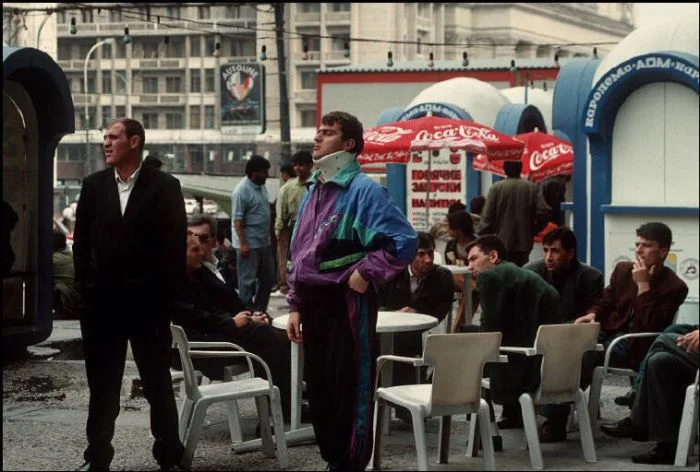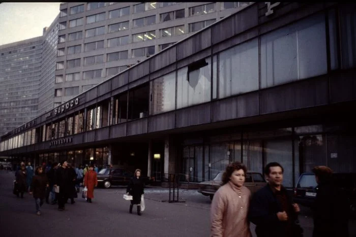20. Октябрь 1993 года, Новый Арбат. Кафе "Бирюса" и соседние заведения лишились окон в результате неспокойных событий путча.
