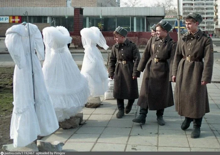 19. На проезде Соломенной Сторожки у кинотеатра "Эстафета" срочники знакомятся с последними веяниями свадебной моды.