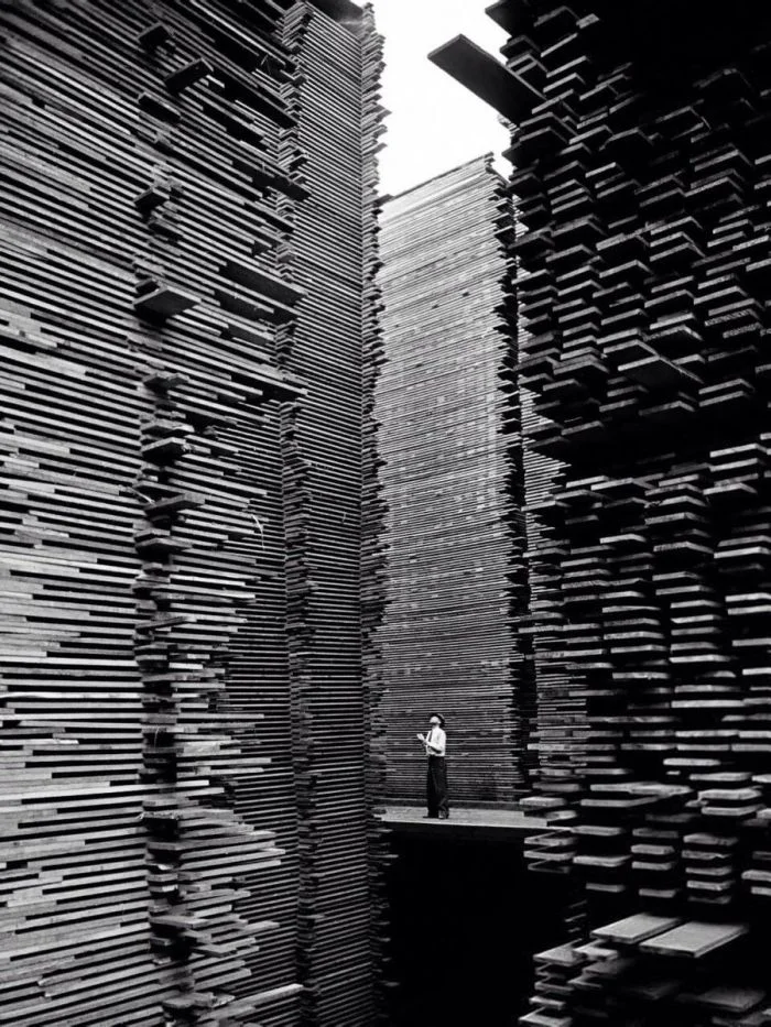 24. Мужчина стоит на складе пиломатериалов компании Seattle Cedar Lumber Manufacturing, 1939 год