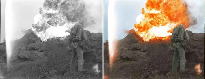 Морской пехотинец стреляет из огнемета во время битвы за Иводзиму в 1945 году.