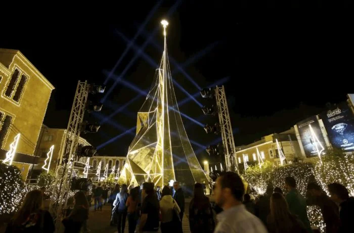 Люди пришли полюбоваться на иллюминированную рождественскую ёлку высотой 12 метров, построенную из 121 старого окна.