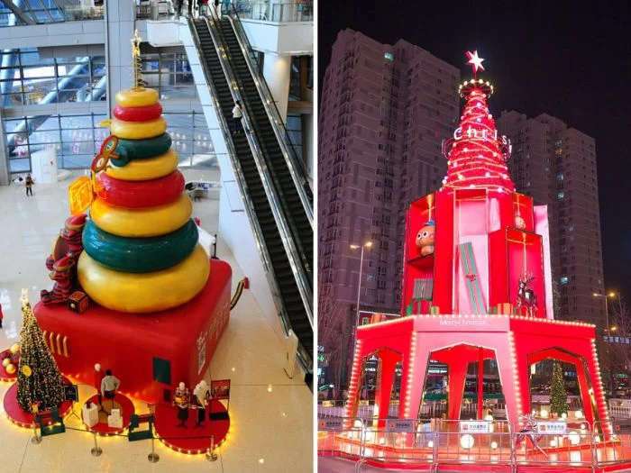 В Китае не так активно празднуют Рождество, как в европейских странах, поэтому установка ёлок тут не такое частое явление. Однако с каждым годом прекрасная традиция распространяется всё активнее, благодаря чему на улицах и в торговых центрах можно увидеть крайне интересные и необычные варианты оформления ёлок.