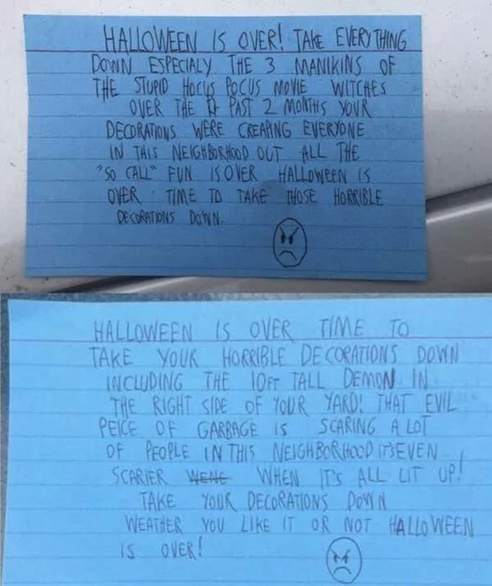 "Хэллоуин закончился. Убирайте весь декор, в том числе трёх манекенов-ведьм из глупого фильма "Фокус-покус". Последние два месяца ваши декорации бесили всех соседей. "Веселье" закончилось. Хэллоуин прошёл. Настало время убрать все эти ужасы""Хэллоуин прошёл. Пришло время убирать ужасные декорации, в том числе 3-метрового демона в правой стороне вашего участка. Этот мусор пугает соседей. А с подсветкой он еще страшнее. Убирайте свои декорации. Нравится вам это или нет, но Хэллоуин закончился!"
