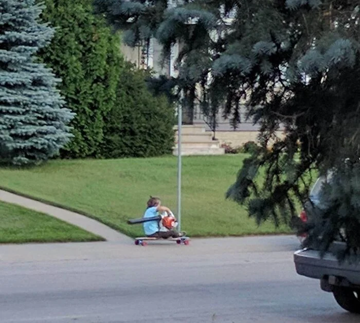 Мальчик использует воздуходувку, чтобы ехать быстрее на скейте