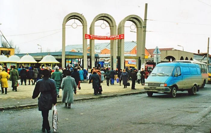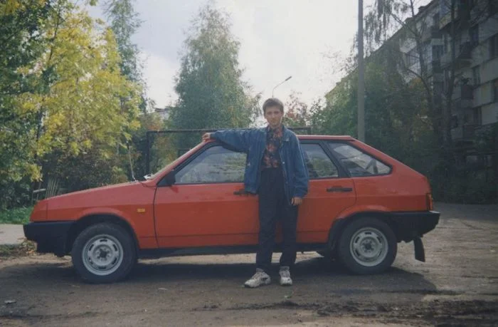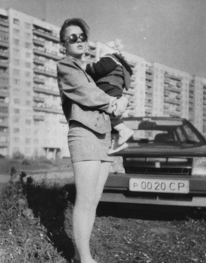 На заднем плане автомобиль ВАЗ 2109. В связи с тем, что 6 сентября 1991 года Ленинград вновь стал Санкт-Петербургом, с 1992 года начали выдавать новые автомобильные номера, на которых вместо букв ЛД или ЛЕ появились СР.