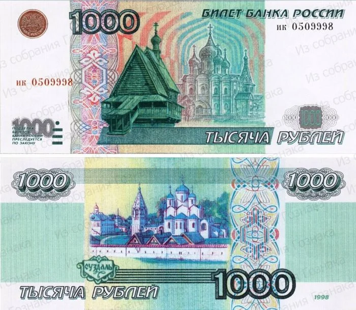 30. Эскизный проект билета Банка России номиналом 1000 рублей. Художник И. С. Крылков. 1998 год