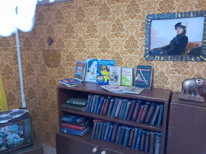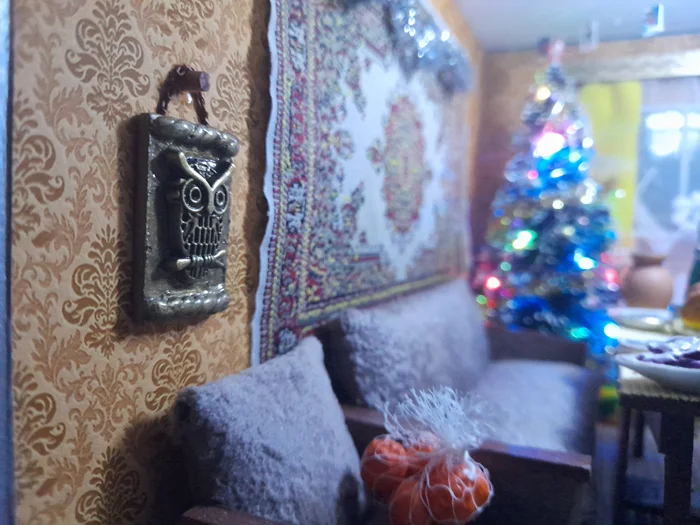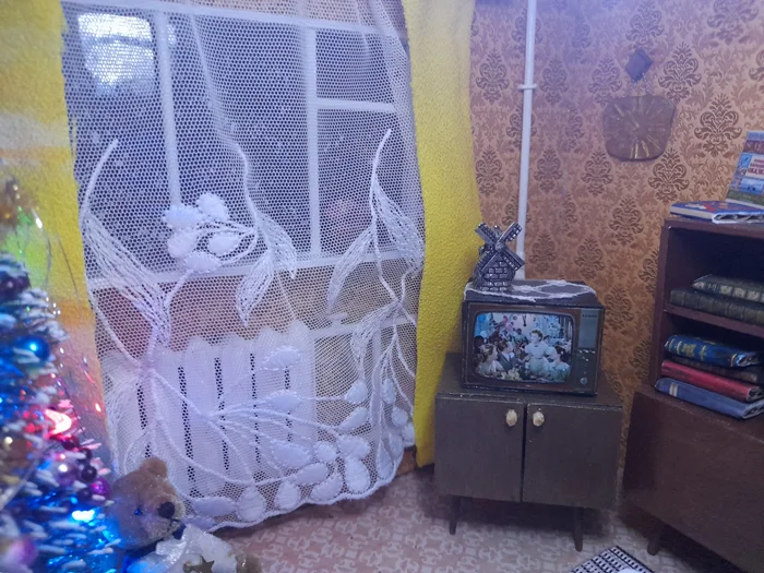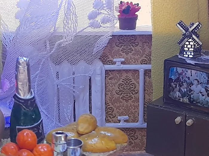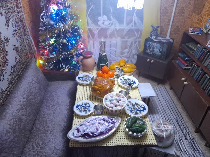 Материалы простые: картон, акриловые краски, кусочки ткани, маленькие гирлянды 1м, распечатки(открытки, флажки, обои, линолеум, книжки), шпажки, сервировочная салфетка(палас на полу), пуговица(поднос хохлома), медвежонок - брелок на телефон, "хрусталь" в серванте из упаковок от витаминок, еда и шампанское из соленого теста и пластилина, ёлка куплена и наряжена бусинами, гирляндами и звездой.