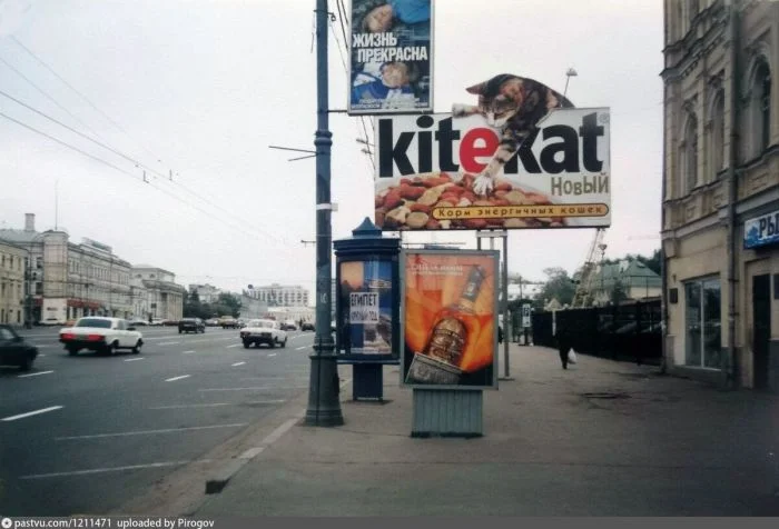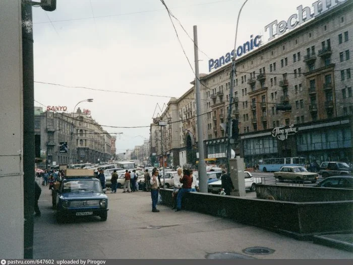 3. Тверская, тогда выглядела вот так. Парковка на тротуаре - да запросто! Повесить огромную рекламу "Панасоника" на дом? Всегда пожалуйста!