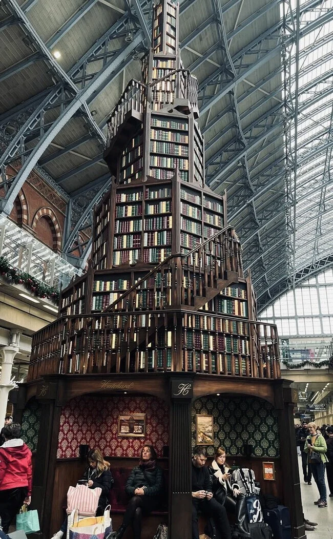 «Рождественская книжная елка, размещенная книжным магазином на железнодорожном вокзале. Внизу места для читателей, ожидающих поезда».