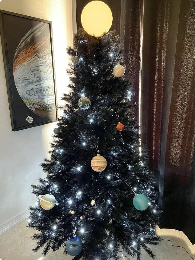 «Не могу налюбоваться на свою космическую ель. Три дня раскрашивала шарики, но это того стоит!».