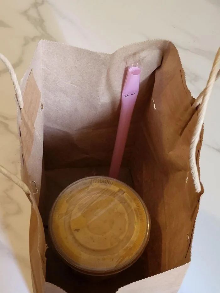 Ресторан прикрепил соломинку к пакету вместо напитка.