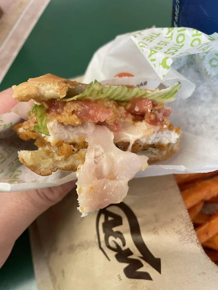 Бургер с курицей выглядит аппетитно только до тех пор, пока не обнаруживаешь, что курица оказалась сырой.