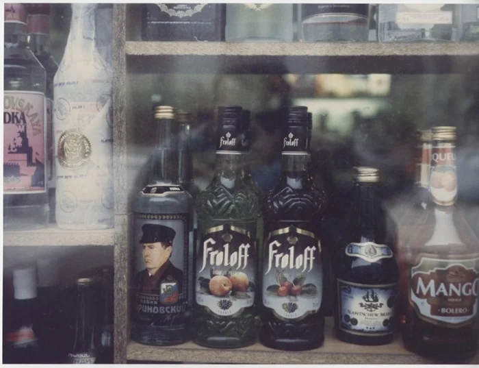 Алкогольный ассортимент в одном из ларьков, 1990-е годы. Слева стоит водка водка «Жириновский».