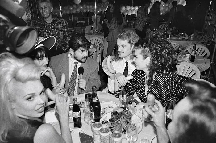 Участники кабаре-дуэта «Академия» Лолита Милявская, Александр Цекало и участники группы «Army of Lovers» на бизнес-презентации. Москва, 12 июля 1993 года.