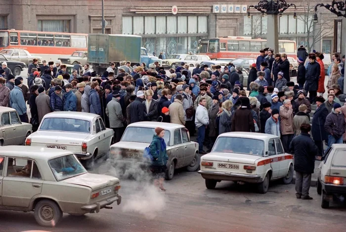 Люди стоят в очереди в сберкассу, 1991 год.