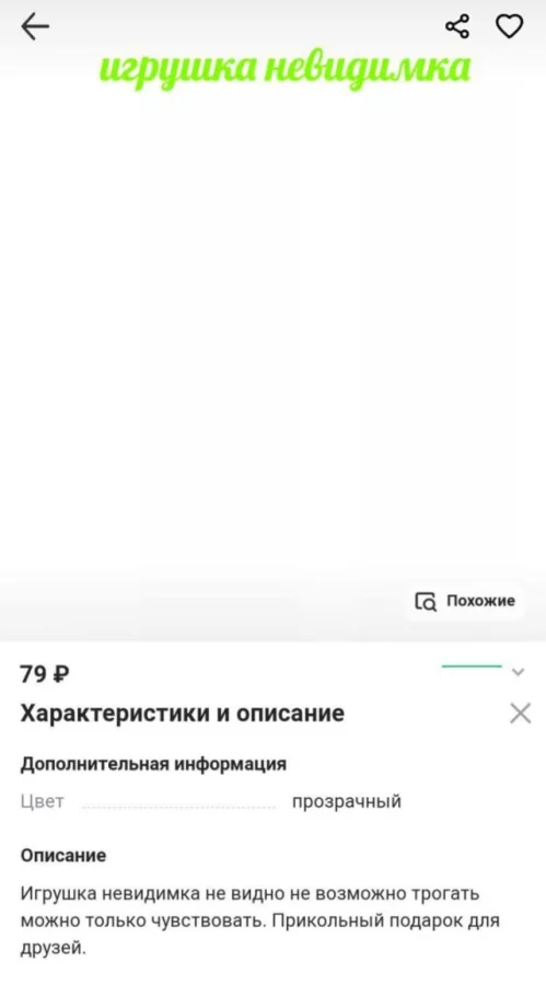 Ох, как было бы здорово, если бы продажа воздуха была законной. Ведь это могло бы принести золотые горы. И, если вы пропустили это, то такие времена уже наступили. Теперь на различных онлайн-рынках можно буквально купить "воздух". А конкретнее — "невидимые игрушки". Продавцы честно и открыто сообщают об этом в описании. И все равно люди покупают "невидимки" и выражают свое недовольство в комментариях. Это не обман, а гениальный стартап с минимальными затратами.