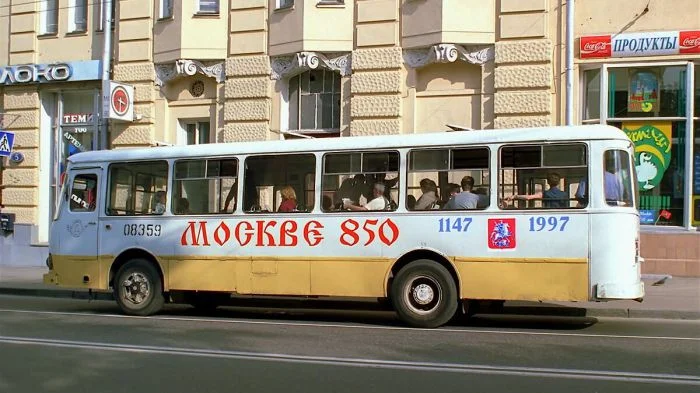 15. Лиаз-677 в раскраске. В 1997 году этих автобусов на маршрутах было довольно много, окончательно они исчезнут с улиц Москвы в 2004 году.