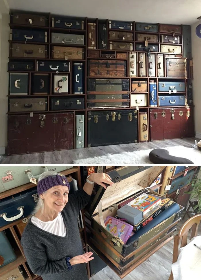 Женщина хранит безделушки и разные вещи в старых чемоданах