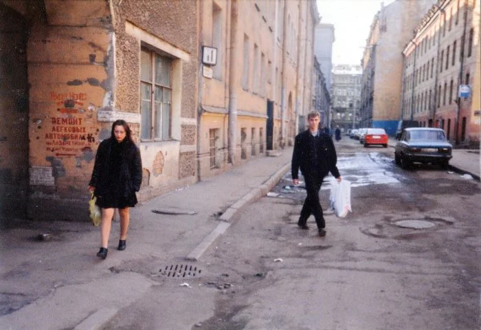 4. Печальные зимы конца 90-х: слякоть, парковка на тротуарах. Пешеходы вынуждены кое-как просачиваться между машин. На фото - Дегтярная улица.