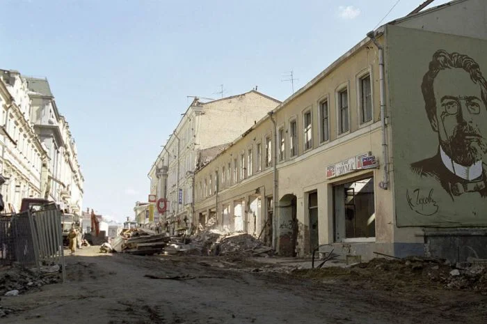 14. Снос бывшей больницы в Очаково для реновации квартала под жилую застройку. За пультом управления экскаватором сидит лично Лужков.