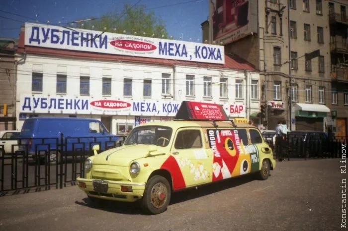15. Из "горбатого" Запорожца сделали лимузин, а из лимузина - реклaмный стенд. Дело происходило на Таганской площади.