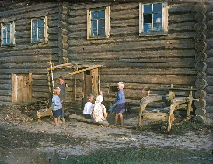 Помощь детей в домашнем хозяйстве: в страду дети пилят дрова.
